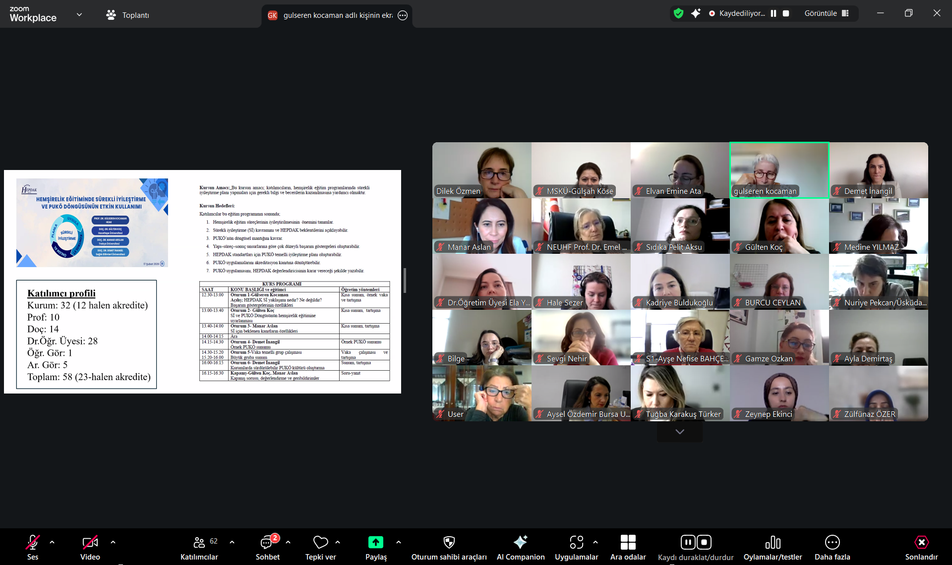 Kursun açılış oturumunda sürekli iyileştirme yaklaşımı ve başarım göstergelerinin özellikleri üzerinde duruldu. Devamında Sİ ve PUKÖ döngüsünün hemşirelik eğitimine uyarlanması, sürekli iyileştirme için beklenen kanıtların niteliği ve örnek PUKÖ uygulamaları katılımcılarla paylaşıldı. Vaka temelli grup çalışmaları ve tartışmalarla desteklenen programda katılımcılar; yapı–süreç–sonuç unsurlarına göre başarım göstergeleri oluşturma, PUKÖ temelli iyileştirme planı hazırlama ve uygulamaları akreditasyon kanıtına dönüştürme konularında uygulamalı deneyim kazandı. Grup sunumları ile deneyimler paylaşılırken, tartışmalarla öğrenme süreci pekiştirildi. Değerlendirme ve geri bildirimlerin alınmasının ardından kurs programı tamamlanmıştır.
