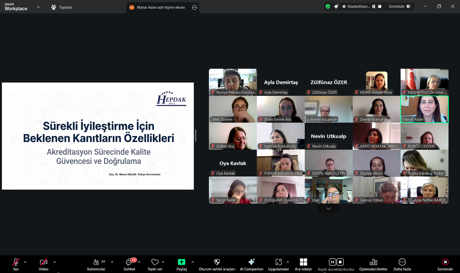 HEPDAK Kurum Eğitimi Çalıştaylarının 13.sü 06-07 Kasım 2025 tarihlerinde iki tam gün olarak çevrimiçi gerçekleştirilmiştir. Ağırlıklı olarak grup çalışmalarıyla yürütülen eğitime 46 farklı kurumdan 89 öğretim elemanı katılmıştır. Eğitimin birinci günü sürekli iyileştirme, ikinci günü ise temel standartlara yönelik grup çalışmaları yapılmıştır. Toplantıda Prof. Dr. Ükke KARABACAK Acıbadem Üniversitesi Sağlık Bilimleri Fakültesi, Doç. Dr. Gülten OKUROĞLU ise Marmara Üniversitesi Sağlık Bilimleri Fakültesi Hemşirelik Bölümünün akreditasyon süreçlerine ilişkin deneyimlerini paylaşmıştır. Toplantı genel tartışma bölümüyle sona ermiştir.