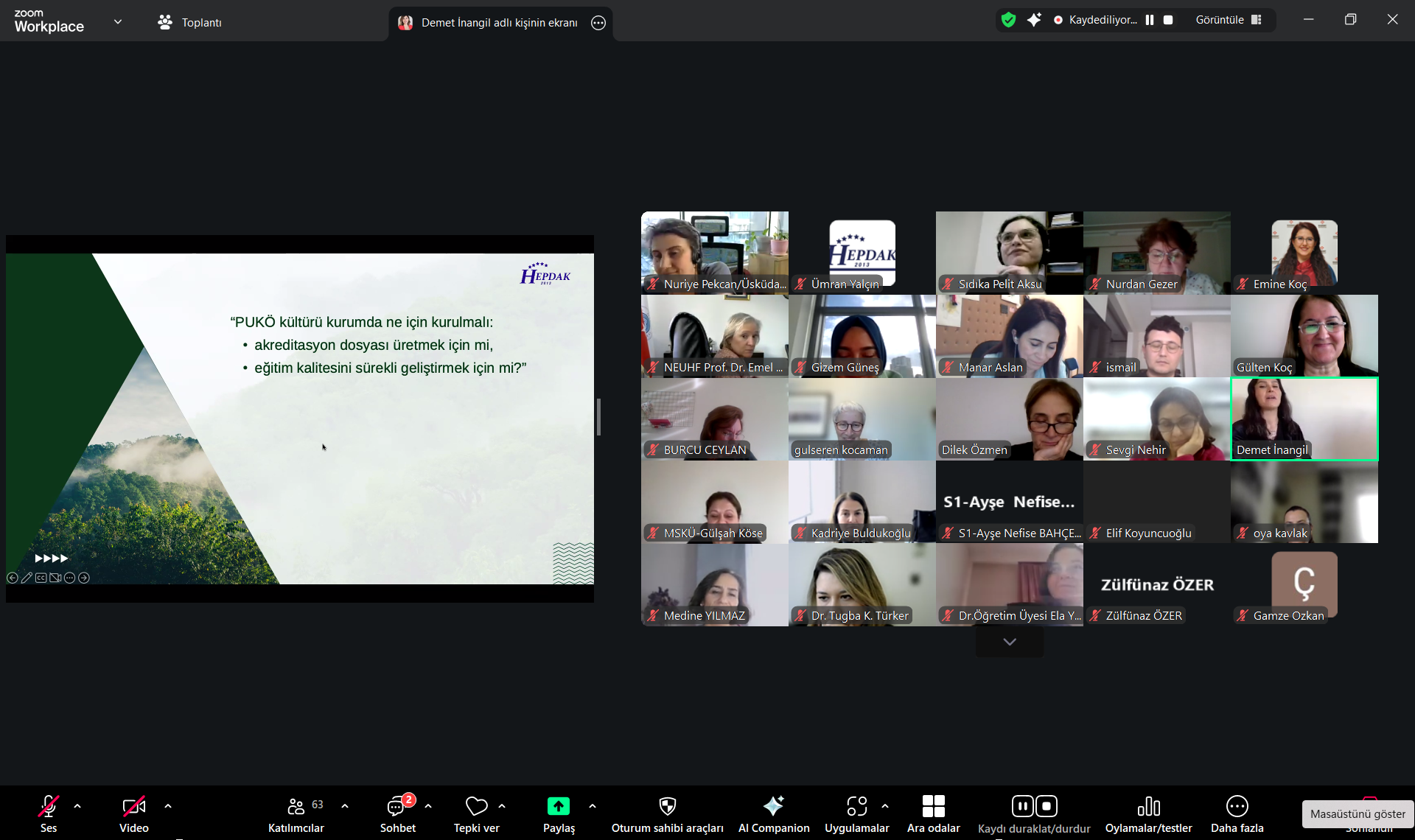Prof. Dr. Gülseren Kocaman, Doç. Dr. Gülten Koç, Doç. Dr. Manar Aslan ve Doç. Dr. Demet İnangil’in eğitici olarak yer aldığı programda; sürekli iyileştirme (Sİ) yaklaşımı, PUKÖ döngüsünün hemşirelik eğitimine entegrasyonu ve akreditasyon sürecinde kanıt oluşturma yöntemleri kapsamlı biçimde ele alındı.